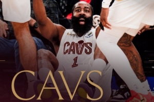 赛后球队发布哈登海报庆祝胜利,画面为哈登坐在地上被队友拉起瞬间。