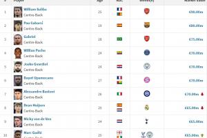 最新全球中后卫身价排名(单位:欧元)↓